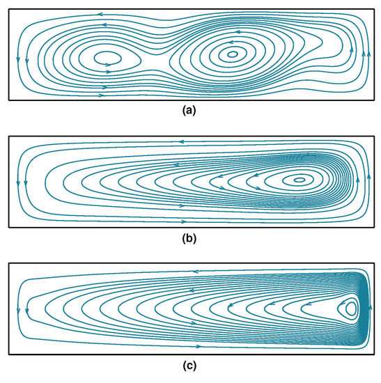 Streamlines for the two-dimensional buoyancy-driven flow problem at , . (a) ; (b) ; (c) .