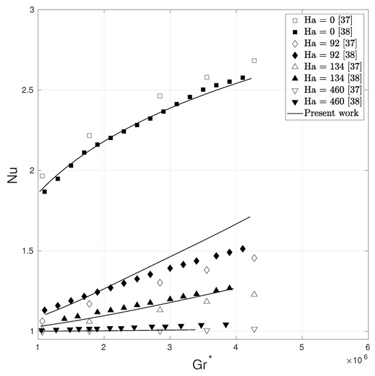 We use a graded mesh of 23,273 nodes and 2592 27-noded hexahedral elements for all Ha values to demonstrate the good coarse-mesh accuracy of the present formulation. Figure 11 shows a very good agreement for the Nusselt number at various and Ha.