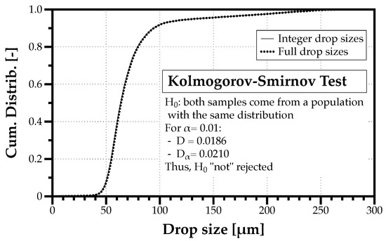 Comparison between the cumulative drop size distributions of the integer part and the full value including the decimal part. A Kolmogorov–Smirnov test with shows that both samples belong to the same distribution.