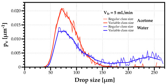 Volume-weighted drop size distributions for acetone (red) and water (blue) comparing regular (thin line) with variable (thick line) class sizes for the volumetric flow rate of mL/min.