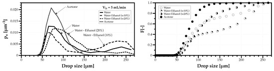 Volume-weighted probability density (left) and cumulative (right) drop size distributions for all fluids considered and a volumetric flow rate of mL/min.