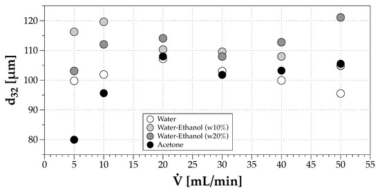 Figure 9 shows a higher variability of when the volumetric flow rate is low (<20 mL/min) considering the different solvents (The mean diameters starting with D represent quantities retrieved from cumulative size distributions, while those starting with d represent mean values from weighted discrete probability distributions. For example, is the mean diameter of an area-weighted drop size distribution. More details in Sowa [36]), and for mL/min, the values are similar, which is consistent with the stabilization of depicted in Figure 8.