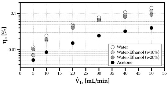 Figure 10 synthesizes the results for the atomization efficiency for all solvents. The effect of the volumetric flow rate is enough to increase the efficiency of the ultrasonic atomizer by one order of magnitude. Considering that does not change significantly with acetone, the results for the atomization efficiency in this case evidence that using liquids with a lower capillary wavelength, produce smaller droplets, thus, perform better, but the energy cost is higher.