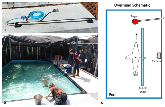 The top-left panel (a) shows the perforated hose used to generate a sheet of seeding bubbles. The bottom-left panel (b) is the pool used for data collection. The image includes SLEWTHS and research team members as well as Cali, the California sea lion that generated the present data. The left panel (c) is an overhead schematic of the experimental setup. The sea lion’s swimming direction and locations of the bubble sheet and camera are shown.