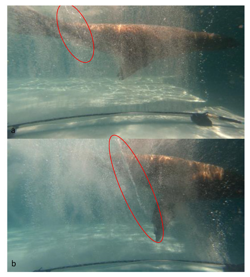 - Fish, F.E.; Legac, P.; Williams, T.M.; Wei, T. Measurement of hydrodynamic force generation by swimming dolphins using bubble DPIV. J. Exp. Biol. 2014, 217, 252–260. [Google Scholar] [CrossRef] [Green Version]