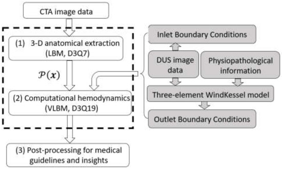 Flow chart of InVascular: (1) 3-D anatomical extraction of vessel segment from CTA image data; (2) ICHD with the inputs of and inlet and outlet BCs based on DUS image data as well as three-element WK model; and (3) post-processing for intepretation and medical insights. The unified LBM (dashed part) is accelerated by GPU parallelism.