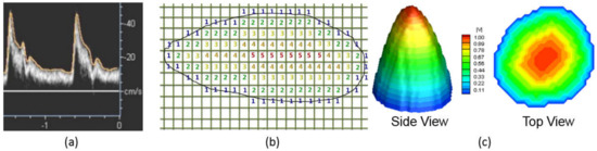 Illustration of inlet boundary condition from DUS image data for an irregular artery plane. (a) A generic DUS image recording velocity magnitude waveform . (b) An example of indexing to construct an irregular paraboloidal velocity profile on the inlet plane. (c) Normalized velocity distribution on inlet plane varying from at the center to zero at the edge.