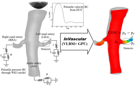 Integration of InVascular with velocity BC from DUS at inlet and pressure BCs through the WK3 model at outlets for quantification of TSPG ( in an aortorenal system extracted from patient’s CTA.