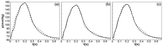 Comparisons of pressure waveforms in (a) AA, (b) RRA, and (c) LRA between noninvasive computation (solid line) and invasive measurement (dashed line).