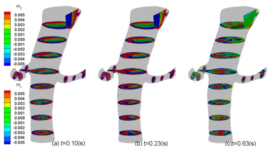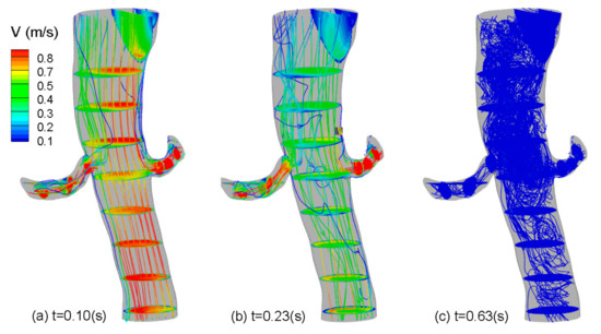 Besides the pressure field, InVascular simultaneously computes the pulsatile velocity field, from which the vorticity and shear stress fields can be calculated. Figure 9 and Figure 10 show the velocity field with magnitude contours and streamlines and vorticity contours, respectively, at t = (a) 0.1, (b) 0.23, and (c) 0.63 in seconds in one cardiac cycle corresponding to systole (heart contraction, flow acceleration), diastole (heart relaxation, flow deceleration), and the end of diastole respectively. In Figure 9, flow in AA is stronger at systole (a) than at diastole (b) but remains intensive in LRA and RRA at both time points and is better organized at systole than at diastole. Whereas at the end of diastole, the flow is weak but chaotic. The vorticity contours shown in Figure 10 are similarly intensive in (a) and (b) with a large degree of skewness in AA, demonstrating the complexity of the flow in the real arteries. At the end of diastole, vorticity contours are much smaller and chaotic.