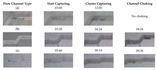 Choking of micro-silica microspheres applied to flow channels of different configurations. (a) Single wing; (b) Stepwise-cascaded wings; (c) In-series cascaded wings. Adapted with permission from [21]. Copyright Year: 16 November 2022. Copyright Owner: Pang-Lun Wang, License number: 5190600500280.