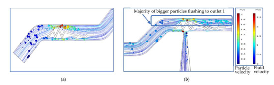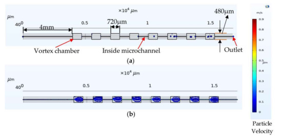 Looking at Figure 13a with fewer streamlines, it is clear that the flow velocity is lesser at the cilia edges after the vortices filled inside the grooves and the flow velocity is higher in the center of the streamlines. This allows the wavy flow’s higher momentum region to take the bigger particles to an outlet and let the lower momentum region take the smaller particles to another outlet. Figure 8a demonstrates that the particle in the first half of the microchannel is accelerated with the inclination and by narrowing the throat of the microchannel by using cilia walls, we are pushing the particles into the cilia wall microchannel where we manually turn the flow into wavy and that induces the bigger particles to flow in the higher momentum region and small particles into the lower momentum region. In the case of Figure 8b, the outlet 2 opening looks respectable for smaller particles to be trapped or guided into outlet 2, while the bigger particles tend to flow downstream. In this way, we can conduct the particles in respected outlets or make the particles stay inside the microchannel to attain a capture rate of around 62–70%.