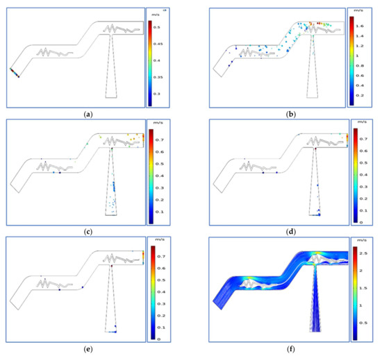 Fluid-particle interaction results of cilia microchip at 0–0.021 s and velocity streamline: (a) 0 s; (b) 0.003 s, (c) 0.005 s; (d) 0.007 s; (e) 0.021 s; (f) Velocity streamlines.