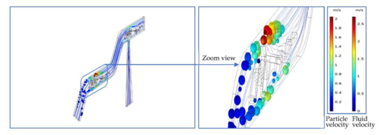 The microchips were designed using AutoCAD software and CFD analysis is performed using COMSOL Multiphysics. The case is internal flow and the viscous effect on the wall dominates the flow behavior which can differentiate particles with different sizes as shown in Figure 3a. Due to the incompressible flow, a time-dependent pressure-based solver and particle tracing solver is used to perform the simulation. All the simulations are carried out for a Newtonian fluid-water with a density of 1000 kg/m3, particle density of 1040 kg/m3, and atmospheric pressure. The dynamic viscosity of the fluid is 1 × 10−3 Pa·s and a temperature of 20 °C is considered.