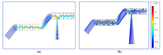In the case of the microchip with cilia walls, the dragonfly wing structure is replaced by cilia walls inside the microchannel. The primary function of cilia is to sweep the fluids and foreign particles to another side. Generally, the size of cilia is irregular, and it is flexible. We have considered cilia as rigid walls inside the microchannel because after the microchip fabrication using PDMS, it won’t be flexible. Considering the cilia wall length, the same dimensions of small and big cilia walls are maintained with the same aspect ratio. If the top side of the microchannel consists of big cilia, then the bottom side will consist of a small cilia wall, and it follows the pattern throughout the straight path of the microchannel. By maintaining this unique pattern and with a 50° inclination at the inlet, we can see the pinched flow is now in a sinusoidal waveform inside the microchannel with the help of cilia walls. Each groove inside the cilia walls is now filled with micro vortices and is shown in Figure 13. The number of vortices is much more in the cilia wall microchip in Figure 13b compared to the corrugated dragonfly wing microchip. Now, cilia walls take account of the fluid and particles. Similar to the previous design, another stage of the microchannel with 50° inclination was included to augment the separation and capture of particles. By looking closely at the velocity streamline, we can notice that the flow follows a sinusoidal function as the cilia walls direct the flow in such pattern and momentum.