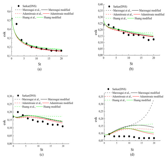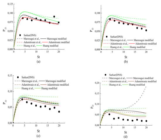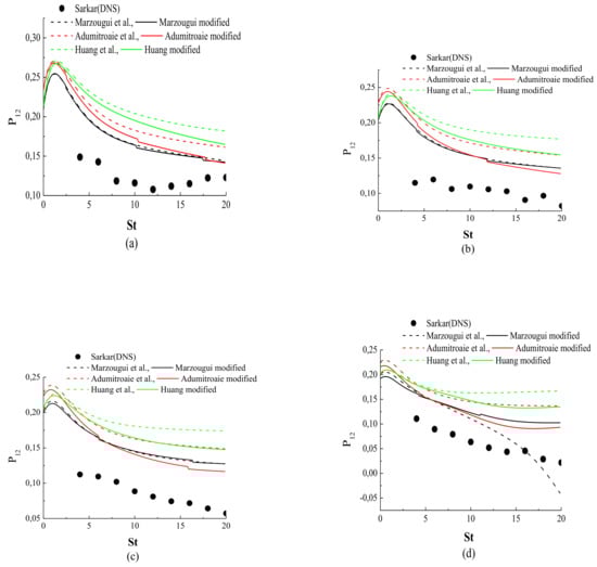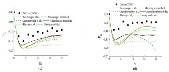 Figure 6, Figure 7 and Figure 8 present the behavior of the pressure-strain correlation , () for cases A1 to A4 from DNS [3].The results for case A1 are shown in Figure 6a, Figure 7a and Figure 8a; all of the models are in qualitative acceptable agreement with the DNS results. The results for cases A2 to A4 are shown in Figure 6b–d, Figure 7b–d and Figure 8b–d; the modified models yielded reasonable agreement with the DNS data, and clearly predicted the reduced pressure-strain components better than their original versions. This was concluded from the DNS results [3,4], in which it is argued that the pressure fluctuations and all components of the pressure-strain correlation showed a monotone decrease with the increasing gradient Mach number.