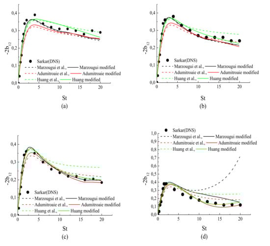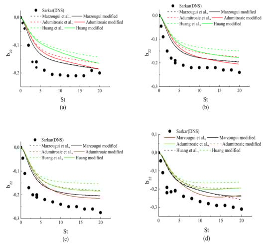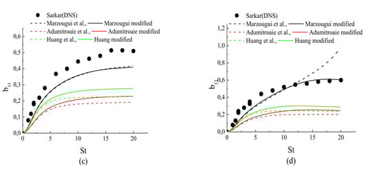 Figure 3d, Figure 4d and Figure 5d show the result predictions for case A4, which corresponds to a high compressibility. The DNS data show that there is a strong amplification of energy arising from the compressibility and then the normal stress components become stronger. The Adumitroaie et al. [11] and Huang et al. [12] models predicted the same anisotropy levels as in previous cases; these models were still unable to predict the changes in the magnitude of the normal Reynolds stress anisotropy when the compressibility was higher. As can be seen in the previous figures, the models [11,12] appear to be insensitive to the increase of the streamwise and the transverse Reynolds stress anisotropies when the compressibility increases. However, these models are in qualitative agreement with the DNS data for the shear stress anisotropy .