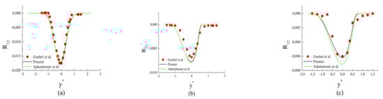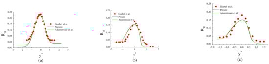 Figure 15 compares the centerline values of the Reynolds stress anisotropy components: , and versus convective Mach number computed by the present model and those given by Adumitroaie et al. model with the DNS datas of Freund et al. [22]. It is found that the present model predicts the decreasing trend of shear stress anisotropy and the increasing trend of all the normal stress anisotropies and with increasing convective Mach number well. The Adumitroaie et al. model shows that such trends occurred, but incorrectely followed the DNS data; thus, the peaks of were not relatively affected by . This gives reason to imply in addition to for the eventual modeling of the pressure-strain correlation, which controls the anisotropy changes arising from the compressibility effects. Regarding Figure 14a, one can remark that both models give nearly similar peaks for , which decrease less than the other components and when increasing . This leads to a monotone increase of all the normal stress anisotropies with , as can be seen in Figure 15a,c; this behavior was found by the DNS of Vreman et al. [6] and Freund et al. [22]. Obviously, this act comes from compressibility via a reduction in the magnitude of all components of the pressure-strain correlation with .