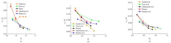 In this work, the simulation was limited to the Adumitroaie et al. [11] and Adumitroaie modified (referred to presently) models, as listed in Table 1 and Table 5. Figure 10, Figure 11, Figure 12 and Figure 13 compare the computed results from the Adumitroaie et al. model and the present models with the experiments of Goebel et al. [7] for three cases: , , and , for which the important characteristic parameter of the developed planar mixing layers is represented in relation to the similarity variable , where y is the local cross stream coordinate and is the cross-stream coordinate corresponding to . The normalized stream mean velocity , is plotted in Figure 10, the calculated profiles for both of the two models are in good agreement with the experiment results for a low convective Mach number , and the largest convective Mach number , as shown in Figure 10a,b, respectively. The expected effects of the two Mach numbers and on the changes in pressure-strain correlation are clearly seen in Figure 11, Figure 12 and Figure 13, which compare the Reynolds similarity intensity profiles as follows: the streamwise intensity , the transverse intensity , and the shear stress obtained by the present model and by Adumitroaie et al. [11] model with the experiment results of Goebel et al. [7]. The two models have nearly similar behaviors for small values of convective Mach numbers (), as observed in Figure 11a,b, Figure 12a,b and Figure 13a,b. When the compressibility is more significant, , Figure 11c, Figure 12c and Figure 13c show that the present model results are in reasonable agreement with the experiment data compared with those obtained by the Adumitroaie et al. [11]. The compressibility effects via the Mc-influence on the mixing layers anisotropy can be more clearly seen in Figure 14, which compares the variation of the maximum values of the Reynolds intensities:, , and versus the convective Mach number with different experiment and DNS data [7,9,10]. We found that the present model better predicts the decrease in the maximum values of all Reynolds stress intensities with increasing the initial value of . However, the influence of on the variation of is not significant (Figure 14a) as can be seen for the other components in Figure 14b,c. This behavior can be found in the analysis of [19], who concluded that the reduction of the pressure-strain directly caused a reduction of . However, the reduction of involved turbulent production and the pressure-strain terms.