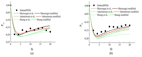 Figure 6, Figure 7 and Figure 8 present the behavior of the pressure-strain correlation , () for cases A1 to A4 from DNS [3].The results for case A1 are shown in Figure 6a, Figure 7a and Figure 8a; all of the models are in qualitative acceptable agreement with the DNS results. The results for cases A2 to A4 are shown in Figure 6b–d, Figure 7b–d and Figure 8b–d; the modified models yielded reasonable agreement with the DNS data, and clearly predicted the reduced pressure-strain components better than their original versions. This was concluded from the DNS results [3,4], in which it is argued that the pressure fluctuations and all components of the pressure-strain correlation showed a monotone decrease with the increasing gradient Mach number.