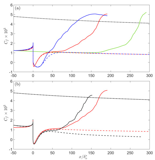 Skin−friction coefficient, . (a) Step-height effect; (b) influence of variable .