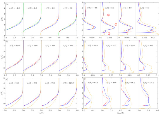 Figure 8 shows the mean velocity and the rms profiles of at selected locations. In the recirculation region, Figure 8a, the mean-velocity profiles collapse above the local inflection point in the ZPG cases; the separated-flow zone only displaces the flow upward, but does not change the velocity profile. The case with variable has a fuller velocity profile, reflecting the FPG upstream of the step. More significant differences can be observed in the reattachment zone and beyond, Figure 8b. The small-step case returns towards a Blasius-like profile earlier than the large-step case, and the variable- case maintains its FPG-like shape. Further downstream, Figure 8c, the mean-velocity profiles begin to diverge, as the large-step case moves towards a turbulent-like profile faster than the other cases; the velocity profile matches the standard equilibrium logarithmic-law slightly beyond the peak of the over-shoot, i.e., at , although the is still higher than the turbulent correlation. In the small-step cases the mean-velocity profiles approach, but never reach, a logarithmic behavior.
