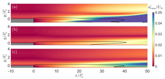 , Figure 8e,f, indicating that the viscous instability is becoming predominant. Non-linear effects are generally considered negligible if . This occurs well within the recirculation region, compared with a flat-plate case in which it would not occur until . Additionally, note how the APG causes the intermediate peak
