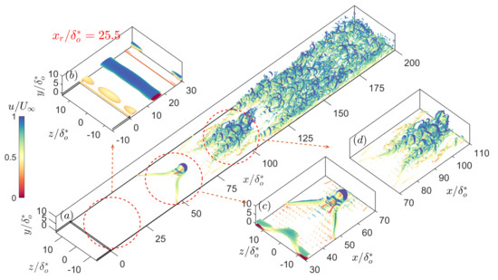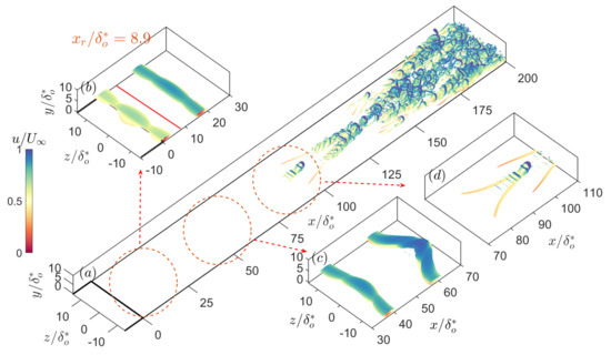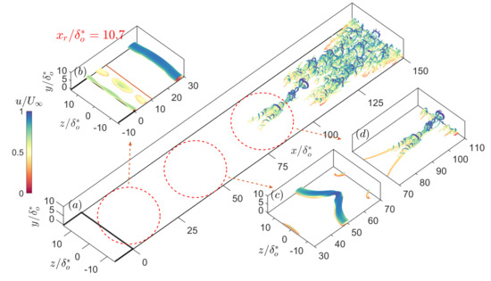 Figure 10, Figure 11 and Figure 12 show the instantaneous vortical structures inside the boundary layer. The iso-surfaces are visualized using the criterion [55] ( is the middle eigenvalue of the strain-rate tensor), colored by the magnitude of the streamwise velocity ( for the variable case); various values of are used to highlight the flow features in different regions. In the large-step case (Figure 10) a large-scale -shaped vortical structure spans the domain. This structure evolves from the spanwise vortices formed immediately downstream of the step as a result of the K-H instability of the separated shear-layer [23], Figure 10b. These vortices form kinks that stretch and lift up due to self-induction, eventually resulting in hairpin-shaped structures, Figure 10c. Shortly after the hairpin head is lifted up small-scale structures start to form, eventually leading to a turbulent-like, random distribution of hairpins. In the small-step case, the vortical structures evolve similarly to those in the large-step one near the step, Figure 11b. The smaller recirculation region, however, limits the development of the 2D rollers; the formation and breakdown of the hairpin vortices are, therefore, delayed. Although the small step accelerates the onset of transition, the overall evolution of the flow structures resembles that of a conventional flat plate, Figure 11a; the characteristic aligned pattern of -shaped vortices, typical of K-type transition, is clear. The variable further accelerates the transition process, Figure 12, without modifying the coherent structures.