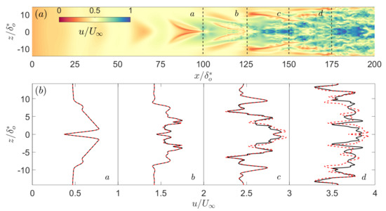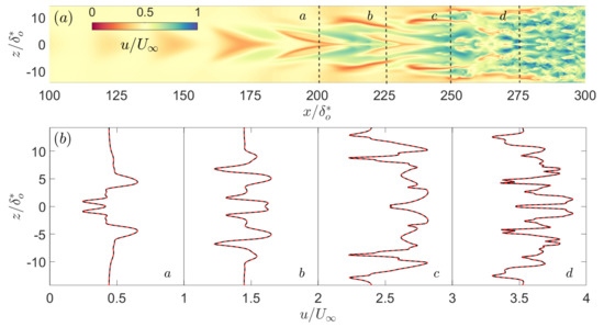 Flat plate. Instantaneous streamwise velocity in the plane. (a) Velocity contours; (b) velocity profiles at the locations indicated by dashed lines in (a).