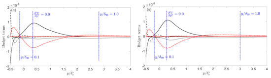The budget terms at are shown in Figure 16. At the streamwise location selected the weakly non-linear effects initially occur in the step cases; terms are scaled using and local . Pressure transport dominates as a gain term, balancing viscous diffusion immediately above the wall; this balance extends to the edge of inner layer, , before pressure transport switches signs and balances production and convection. As distance further increases, pressure work and convection reach a balance, which is maintained beyond the edge of the boundary layer. Neither the step height, Figure 16a,c, nor the freestream pressure gradient, Figure 16b, modify the budget characteristics; only the magnitude of the various terms is increased. The production, which represents the energy transfer from the mean flow to the perturbations, always has a peak near the inflection point (the second vertical line in Figure 16a–c); this phenomenon is observed throughout the flow field, as indicated in Figure 16d which shows the region of high production always straddling the inflection point. Finally, unlike what is observed in equilibrium boundary layers, the convection here plays a significant role, transferring energy away from the wall, and pressure work balances the production through most of the boundary layer, but changes sign and becomes the predominant gain term in the outer region of the flow.