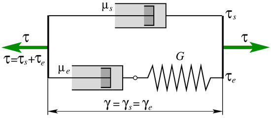 Simple mechanical models can be used to illustrate the typical behavior of viscoelastic materials, where a dashpot (piston moving inside a cylinder filled with a liquid) represents a viscous (Newtonian) fluid and a spring stands for an elastic (Hookean) solid. These elements can be connected in series or in parallel and combined to represent several deformation-stress models to analyze the behavior of different viscoelastic materials [24]. The combination of the Newtonian model and the Maxwell model joined in parallel shown in Figure 1 represents the mechanical analogue of the Johnson–Segalman model (3).