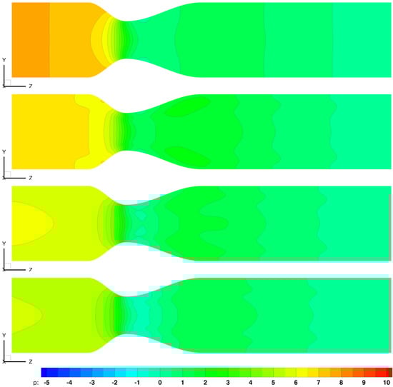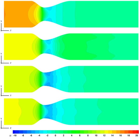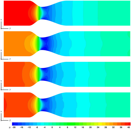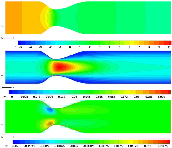 In all presented simulations the pressure is set to zero at the outlet (right) boundary, therefore the maximum is reached at the inlet (left) boundary. The density of pressure contour lines in the stenosed region indicates high local pressure gradient leading to significant flow acceleration visible in the axial velocity contours (central part of the stenosed region). The radial velocity field is axially anti-symmetric, showing the appropriate flow tendency towards the axis or the wall, following the same behavior of the nearest wall geometry.
