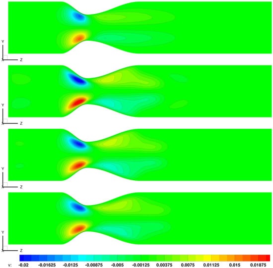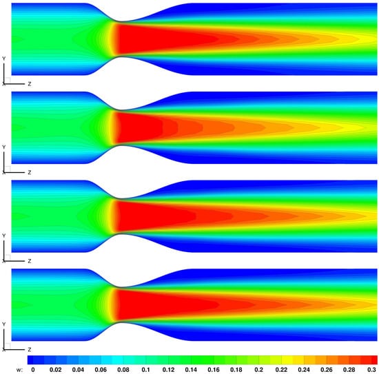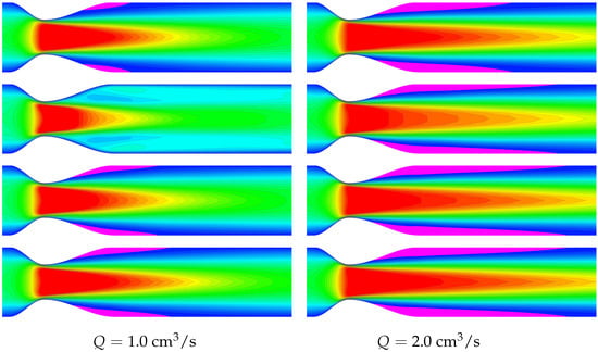 Comparing the profiles of the velocity fields in Figure 11 for cm/s with results obtained for higher flow rates shown in Figure 12 and Figure 13 reveals that for lower flow rates the velocity profiles become smoother, with more rounded contour lines downstream the stenosis, due to lower flow separation and recirculation. This is caused by the effect of shear-thinning behavior, where for lower shear rates (i.e., lower flow rates) the shear dependent viscosity provides higher values, closer to . In a straight tube (non-stenosed vessel) the zero shear rate is always achieved at the central axis and its value increases towards the wall (see, e.g., [18,22,30]). The viscosity thus behaves accordingly, exhibiting its maximum at the axis, dropping significantly towards the wall. Of course, as demonstrated in [22], the behavior is more complex in non-trivial geometries with significant flow acceleration/deceleration or streamlines curvature.