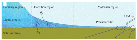 When a liquid is in contact with a substrate in a gaseous environment, a contact line is formed. The contact line, also known as the three-phase contact line, is a line of intersection of three phases: solid, liquid, and gas. The contact line moves on the substrate until the total energy of the contact line reaches its minimum value, which is the thermodynamic equilibrium state. In this dynamic condition, the contact line is defined as the dynamic contact line [1,2,3,4,5,6,7,8,9,10,11,12,13,14,15,16,17,18,19,20,21,22].