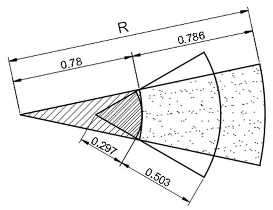 As explained above, the driving stress can be the same for different particle shapes and have different velocities. As they have the same driving stress, they also have the same tributary volume but different curvatures, as shown in Figure 2 presenting the geometry with dimensions in microns of two tributary volumes mobilizing the same . The calculations leading to the dimensions shown Figure 2 are described later in this section. In Figure 2, the spherical region of radius R represents the proxy construct leading to the velocity profile and velocity on the wall of the kGa-1 particle and the smaller spherical region represents a sphere that mobilizes the same wall shear as kGa-1. The quantity = 0.786 in Figure 2 from the volumetric relationships is