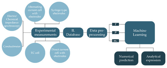 The experimental measurements of ILs’ physical quantities, such as conductivity, viscosity, and density, as a function of temperature or pressure, are usually performed with optofluidic and microscopic techniques [22,23], and empirical relations have been drawn to guide the experiments [24]. On the other hand, research efforts on property calculation have been mainly based on trial-and-error methods to bind anions and cations to constitute an IL of desired properties. Computational property estimation can bring research to the next level through the incorporation of novel ML methods [25]. Recent studies refer to ML techniques for ILS property prediction, such as viscosity and electrical conductivity [26], CO2 capture capability [27], density, heat capacity, and thermal conductivity [28], among others, trying to depict the relationship between property and molecular structure, and environmental conditions.