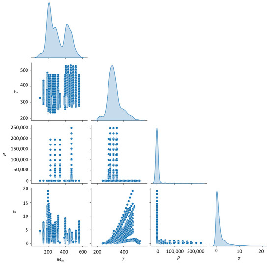 The statistical information for the input data can be obtained from the pair plot diagram in Figure 3. The distribution of the three input parameters, T, P, and Mw, and the output, σ, is shown. The investigated ionic liquid is distinguished by the value of the molecular weight, which, in this paper, ranged from . The temperature and pressure conditions were , and , respectively. The output was in the range of .