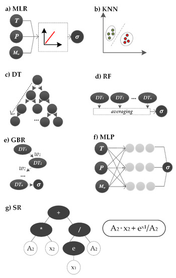 Graphical implementation of ML algorithms incorporated in this paper: (a) multiple linear regression; (b) k-nearest neighbors; (c) decision tree, (d) random forest; (e) gradient boosting regressor; (f) multi-layer perceptron; (g) symbolic regression.
