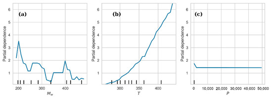 To analyze the effect of each input parameter on the acquired electrical conductivity value, σ, a partial dependence plot was constructed (Figure 5). The partial dependence plot calculates the average marginal effect on the σ prediction when only one input variable changes its value, and, in parallel, the remaining inputs remain constant. The estimation of the partial dependence (normalized value) is shown on the vertical axis and the respective input on the horizontal axis. In Figure 5a, it is observed that the molecular weight significantly affected σ, especially on smaller values around 200–230. The effect of temperature was prominent, especially for the values above 270 K (Figure 5b). On the other hand, pressure had only a slight, inversely linear effect on σ for small pressure values, since partial dependence decreased as the pressure increased (Figure 5c). Furthermore, it seems that σ was practically unaffected by P for the values above 100 kPa.