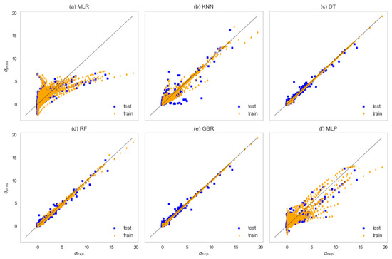 Experimental vs. predicted values for electrical conductivity with six different ML algorithms: (a) MLR; (b) KNN; (c) DT; (d) RI (e) GBR; (f) MLP. The 45o straight line denotes perfect match.
