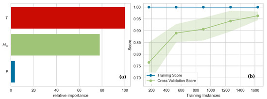 Let us now turn our attention to finding the most important input feature that controls the internal mechanism of the algorithmic decisions for the GBR. The feature importance plot in Figure 7a presents an estimation of the importance of each input variable on the prediction of the electrical conductivity value. Temperature, T, was found to be the most important parameter that guided the decisions between the DTs and the branches of the GBR architecture. This is in agreement with the widely used empirical Equations (1)–(2), where T is the only parameter that affects electrical conductivity. The next important feature was the molecular weight, Mw, as it was the main parameter in the proposed model that differentiated between the various types of incorporated ILs. Pressure, P, had only a small effect on the final result. As is also shown in the partial dependence plot of Figure 5, P affected σ only for small values (around P = 100 kPa), and no effect was observed above this limit.