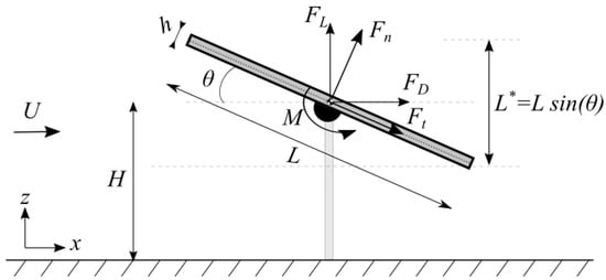 The extreme slenderness of the solar PV panels, however, has brought aerodynamic challenges that need to be overcome as they can undergo extreme wind-induced motions that trigger aeroelastic phenomena which can eventually collapse the structure [5]. The aerodynamic response of the structure mainly depends on the incoming wind conditions, namely speed and direction, and the tilt angle adopted by the panel. Recent research has suggested that the mechanical properties of the solar tracker, such as its inertia, damping and stiffness, determines whether a given wind speed triggers the phenomenon of flutter [6,7]. This fluid–structure interaction is complex due the unique characteristics of solar panels such as: (1) they operate in a wide range of tilt angles, including positions parallel to the ground up to ; (2) they have extremely slender structures (i.e., the length-to-thickness ratio can be well beyond 20) which decouples the turbulent flow structures generated at the leading and trailing edges; (3) they have a single degree of freedom that corresponds to the torsional moment without vertical or horizontal displacement; (4) the natural frequencies of the system derive from the stiffness, only provided by the torsional axis, and inertia, which only depends on that of the panel; (5) the distance to the bottom ground h relative to the panel’s length L is relatively small, e.g., is normally between 1.2 and 1.8, which generates an aerodynamic ground effect that changes the wake dynamics; and, (6) in large-scale farms, the different rows of panels induce an internal boundary layer that modify the onset flow conditions for each row [8,9].