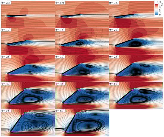 For tilt angles below , there is a nearly linear increase in from the minimum at with = 0.12. Over the range of negative tilt angles, i.e., with the leading edge closer to the bottom surface, the overall pattern is similar to the positive tilt angles but with larger Strouhal values which again peak at = , as depicted in Figure 9a,b. This curve asymmetry between the positive and negative tilt angles is due to the proximity of the panel’s edges to the bottom surface. For negative angles, the suction surface faces the bottom ground and generates a high-speed region that accelerates the vortex shedding (Figure 7). Conversely, with positive angles, it is the trailing edge which is the one closer to the ground but with the suction side looking in the opposite direction from the bottom ground, allowing the structure to develop and shed vortices unaffected by the ground (Figure 6).