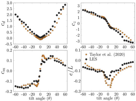 The forces acting on the panel vary depending on the tilt angle magnitude and whether this is positive or negative. The immersed boundary method provides the reaction forces of the panel in the Cartesian coordinates ( and ) which are adopted to compute the torsional moment (, Equation (3)) as well as the drag and normal force directions. Figure 8 presents the drag, normal force and torsional moment coefficients together with the force eccentricity normalised by the panel’s length ( with ). The current LES results are compared with those of Taylor and Browne [23] who used a section model to determine the aerodynamic characteristics of a panel under no turbulent flow conditions. The drag force coefficient indicates that, with increasing tilt angle, the force on the panel in the wind direction increases, which is in agreement with the experimental data [23]. For panel positions at , values have a similar magnitude between positive and negative angles. However, the effect of the proximity to the ground starts to be noticeable at with an asymmetric force increment, i.e., forces are larger with positive angles (the panel acts as a diffuser) compared to the results for negative values (when the leading edge is pointing towards the bottom surface). Note that the current results are for a solar PV panel configuration with a gap ratio equal to 1.5 which can vary these coefficients if this parameter changes as in the case of circular cylinders [36].
