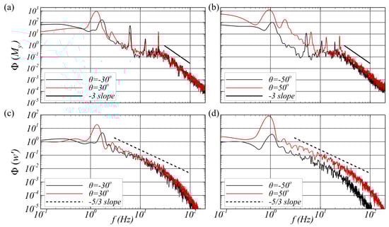 The frequency of the vortex shedding is investigated with the Fourier transform using the pwelch technique applied to the time history of the structure’s torsional moment () and vertical velocity fluctuation at a point located at , downwind. Spectra obtained for cases with and are shown in Figure 9 as they represent the scenarios for the highest torsional moment and stall conditions, respectively. The most energetic peak is observed at a frequency close to the unity that corresponds to the shedding of von Kármán structures as their signature is also captured in the velocity spectra in the panel’s wake characterised by a single peak at the same frequency (Figure 9c,d). Note that, in the latter plots, the Kolmogorov’s turbulence slope of –5/3 is observed over a frequency range starting at the most energetic peak up to approximately 30 Hz after which the energy decay rate increases.