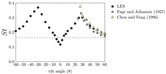 Strouhal number () obtained for the range of LES-computed tilt angles (circles) and experimental data [27,28]. The dashed line indicates the theoretical value of = 0.165.