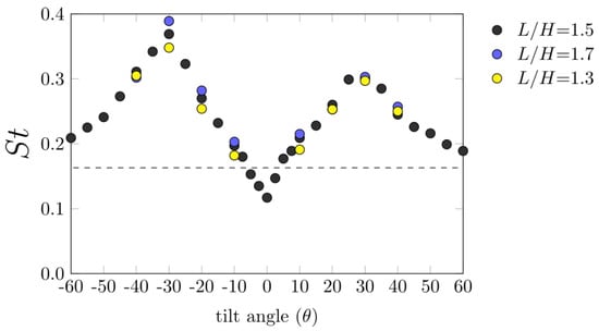 Strouhal number () obtained for the range of tilt angles simulated for = 1.3, 1.5 and 1.7. Dashed line indicates the theoretical value of = 0.165.