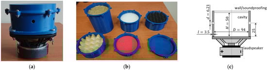 In the paper, the SJ with soundproofing in the cavity was tested. The multi-orifice actuator, used in this investigation, is shown in Figure 1. The actuator body was printed from Z-ULTRAT (material based on ABS—acrylonitrile butadiene styrene) using 3D technology. The wall thickness was 3.5 mm. The cavity diameter was 95 mm, and the cavity height was 50 mm. In the body were six orifices with a diameter of 6.21 mm (value measured on the model). The orifices were arranged symmetrically around the perimeter. The orifices were made halfway between the loudspeaker and the opposite wall (Figure 1c). The mid-range woofer SB Acoustics SB12PAC25-4/4” was used.