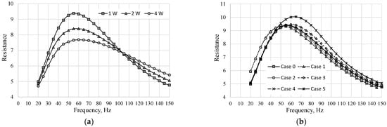 Figure 2 presents the resistance in the function of the actuator frequency at different real power for Case 0 (Figure 2a) and at the real power equal to 1 W for all investigated cases (Figure 2b). The resonant frequency of the actuator can be determined as a local maximum of the actuator resistance. The resonant frequency of Case 0 was determined as 55 Hz at real power 1 W and 2 W and as 60 Hz at 3 W. However, the resonant frequency is independent of the power of the actuator. The difference in the resonant frequency value determined from Figure 2a was caused by the large step of the frequency (5 Hz) and it should be assumed that the real value of the resonant frequency of Case 0 was in the range from 55 to 60 Hz. For the sake of simplicity, the resonance frequencies were determined for the power of 1 W. Based on Figure 2b, the characteristics frequency for subsequent (from 0 to 5) cases was: 55; 55; 60; 60; 55; and 65 Hz.