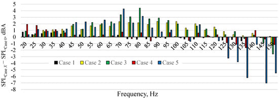 Figure 3 presents the SPL as a function of frequency. The SPL at different real power for case 0 is presented in Figure 3a. The SPL increased with the frequency and the measured curves had the same course regardless of the power. Therefore, only the SPL at the real power of 4 W for all cases is shown in Figure 3b. Figure 3b was hardly legible due to the amount of data presented. For this reason, the SPL for cases 1, 2, 3, 4, and 5 decreased by SPL for case 0 is presented in Figure 4. The positive value in Figure 4 means that the SPL generated by the actuator was higher than the SPL for case 0, at the same frequency. The negative value means that the generated noise was lower than in case 0. It should be also noted that the accuracy of measurements was ±1.4 dB.